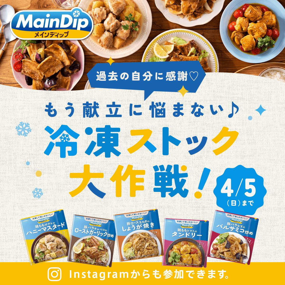 Instagramでは、非公開アカウントによる投稿や『#メインディップ』 『#冷凍ストック大作戦』および 『#スナップディッシュ』または『#snapdish』のハッシュタグがついていない投稿は、応募対象外となります。(未成年の方が応募する場合)応募条件や応募規約を保護者とともに確認の上ご応募いただける方。